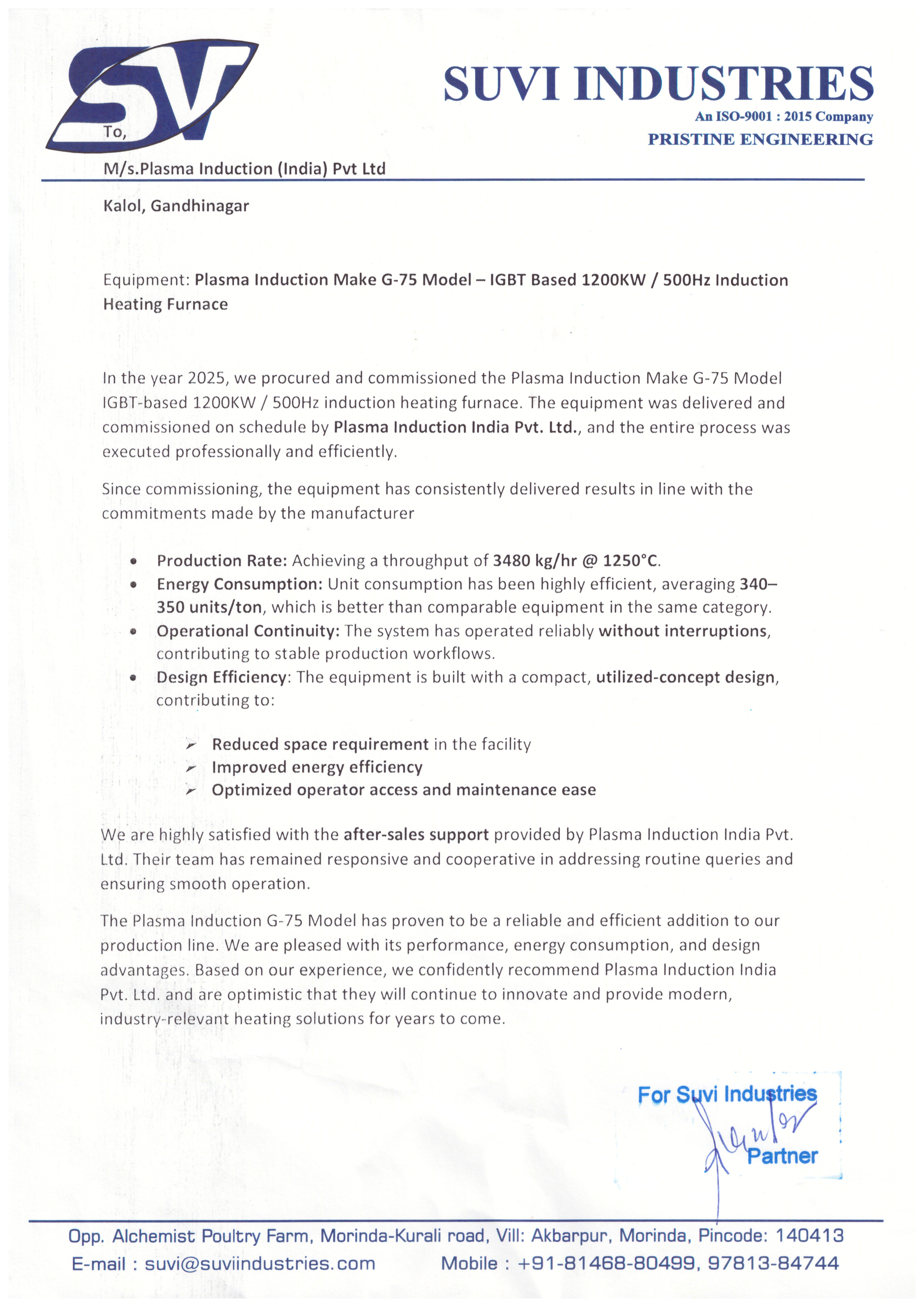 "We are using “Plasma Induction” 350KW with 500KG induction melting furnace since 2011 & so far our experience is good. We are getting proper result as per commitment and equipment are energy efficient. We sincerely recommend them as a trustable & reliable brand."