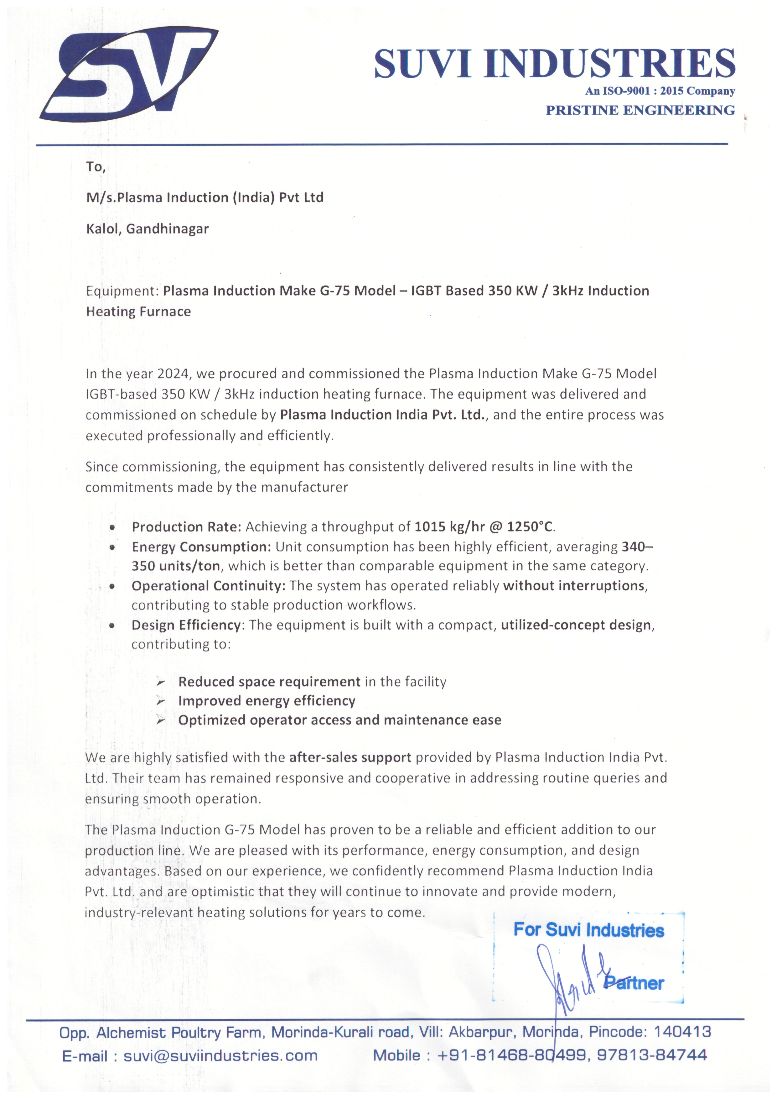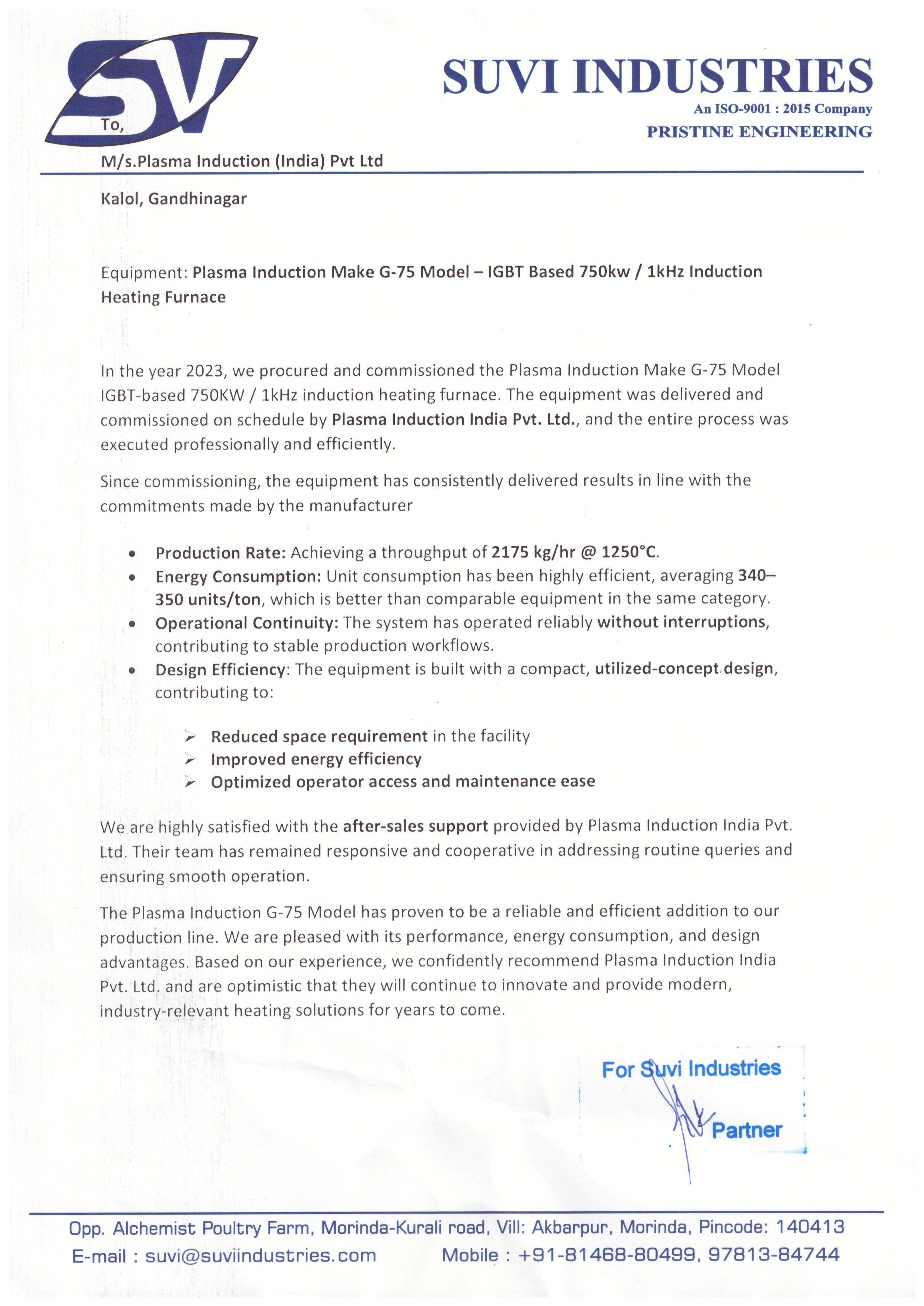 "We have purchased PLASMA INDUCTION Make G-30 Model IGBT based 350KW induction billet heater in the year 2017. We are getting proper results as per commitment and equipment is compact and energy efficient. We are sure that equipment has good quality with excellent workmanship."